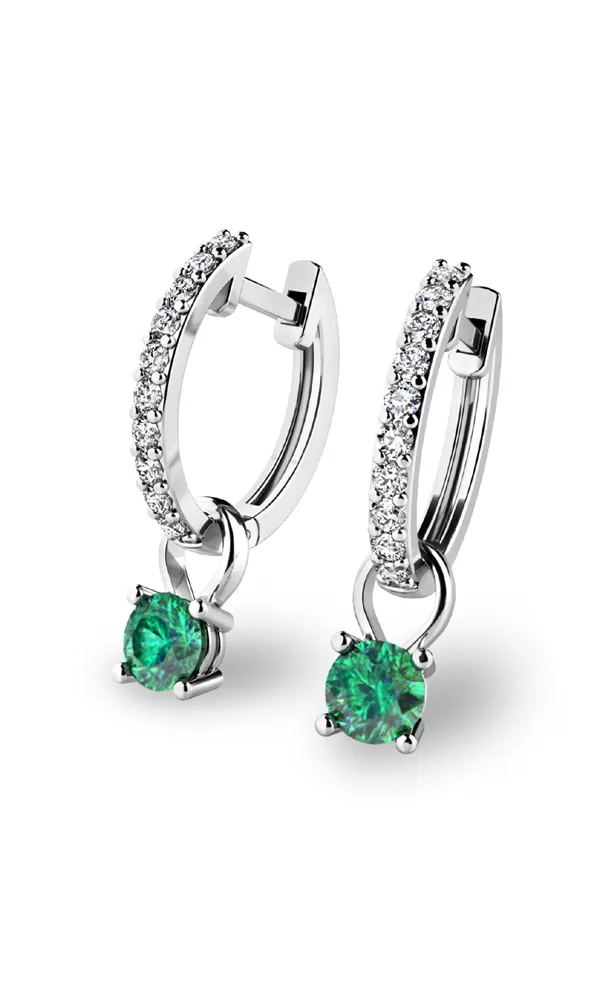 Kruhové náušnice patří mezi velmi oblíbený šperk. Náušnice jsou vhodné pro každodenní nošení i na společenské akce a sluší každé ženě. Tento model je zdoben dvaceti diamanty a dvěma smaragdy vsazenými do přívěsků. Všechny kameny jsou v briliantovém brusu, díky kterému dokonale odráží světlo a neuvěřitelné září. Vsazování diamantů a drahých kamenů provádějí naši nejzkušenější mistři zlatníci ručně pod mikroskopem s přesností na 0,01mm a proto nehrozí vypadnutí kamínků jako to bývá u strojně vyráběných náušnic. Tyto nádherné náušnice jsou vyrobeny z bílého čtrnáctikarátového zlata - 585/1000 v lesklé povrchové úpravě.