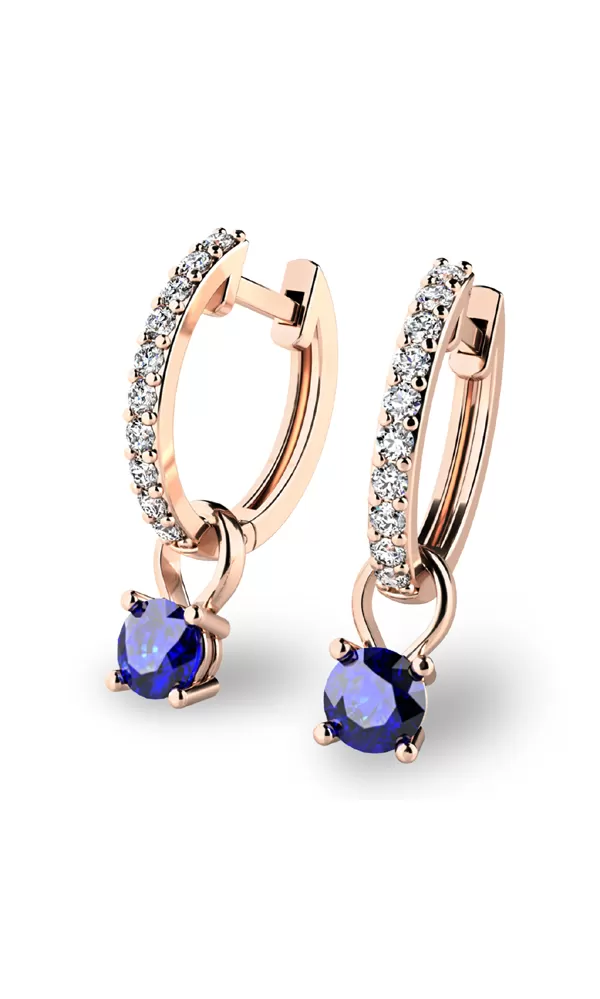 Kruhové náušnice patří mezi velmi oblíbený šperk. Náušnice jsou vhodné pro každodenní nošení i na společenské akce a sluší každé ženě. Tyto nádherné náušnice jsou vyrobeny z růžového čtrnáctikarátového zlata - 585/1000 v lesklé povrchové úpravě jsou zdobeny dvaceti diamanty a dvěma safíry vsazenými do přívěsků. Všechny kameny jsou v briliantovém brusu, díky kterému dokonale odráží světlo a neuvěřitelné září. Vsazování diamantů a drahých kamenů provádějí naši nejzkušenější mistři zlatníci ručně pod mikroskopem s přesností na 0,01mm a proto nehrozí vypadnutí kamínků jako to bývá u strojně vyráběných náušnic.
