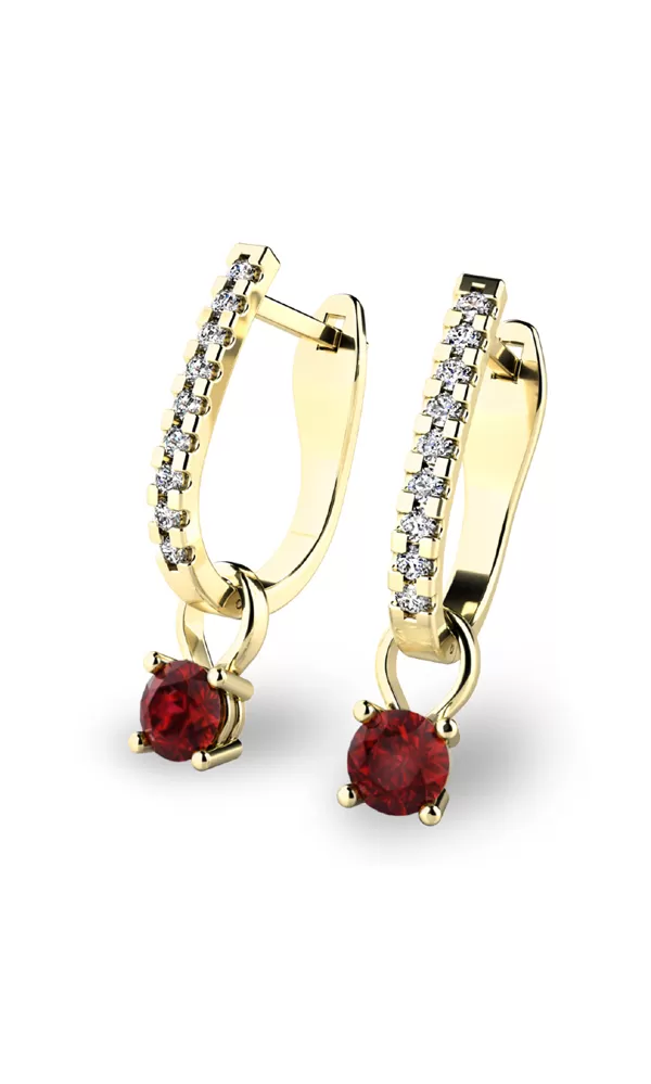 Náušnice "podkovičky" patří mezi velmi oblíbený typ náušnic, které jsou vhodné pro každodenní nošení i na společenské akce a sluší každé ženě. Tento model je zdoben osmnácti diamanty a dvěma granáty vsazenými do přívěsků. Všechny kameny jsou v briliantovém brusu, díky kterému dokonale odráží světlo a neuvěřitelné září. Vsazování diamantů a drahých kamenů provádějí naši nejzkušenější mistři zlatníci ručně pod mikroskopem s přesností na 0,01mm a proto nehrozí vypadnutí kamínků jako to bývá u strojně vyráběných náušnic. Tyto nádherné náušnice jsou vyrobeny ze žlutého čtrnáctikarátového zlata - 585/1000 v lesklé povrchové úpravě.