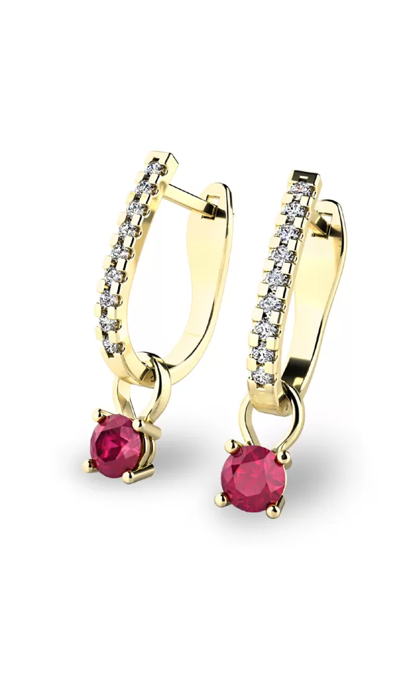 Náušnice "podkovičky" patří mezi velmi oblíbený typ náušnic, které jsou vhodné pro každodenní nošení i na společenské akce a sluší každé ženě. Tento model je zdoben osmnácti diamanty a dvěma červenými rubíny vsazenými do přívěsků. Všechny kameny jsou v briliantovém brusu, díky kterému dokonale odráží světlo a neuvěřitelné září. Vsazování diamantů a drahých kamenů provádějí naši nejzkušenější mistři zlatníci ručně pod mikroskopem s přesností na 0,01mm a proto nehrozí vypadnutí kamínků jako to bývá u strojně vyráběných náušnic. Tyto nádherné náušnice jsou vyrobeny ze žlutého čtrnáctikarátového zlata - 585/1000 v lesklé povrchové úpravě.