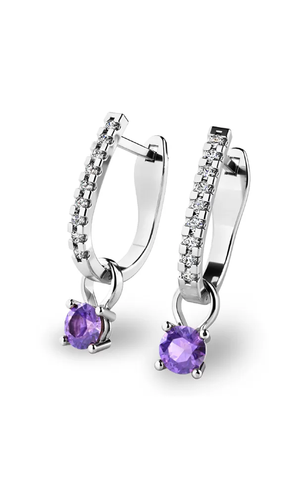 Náušnice "podkovičky" patří mezi velmi oblíbený typ náušnic, které jsou vhodné pro každodenní nošení i na společenské akce a sluší každé ženě. Tento model je zdoben osmnácti diamanty a dvěma tanzanity vsazenými do přívěsků. Všechny kameny jsou v briliantovém brusu, díky kterému dokonale odráží světlo a neuvěřitelné září. Vsazování diamantů a drahých kamenů provádějí naši nejzkušenější mistři zlatníci ručně pod mikroskopem s přesností na 0,01mm a proto nehrozí vypadnutí kamínků jako to bývá u strojně vyráběných náušnic. Tyto nádherné náušnice jsou vyrobeny z bílého čtrnáctikarátového zlata - 585/1000 v lesklé povrchové úpravě.