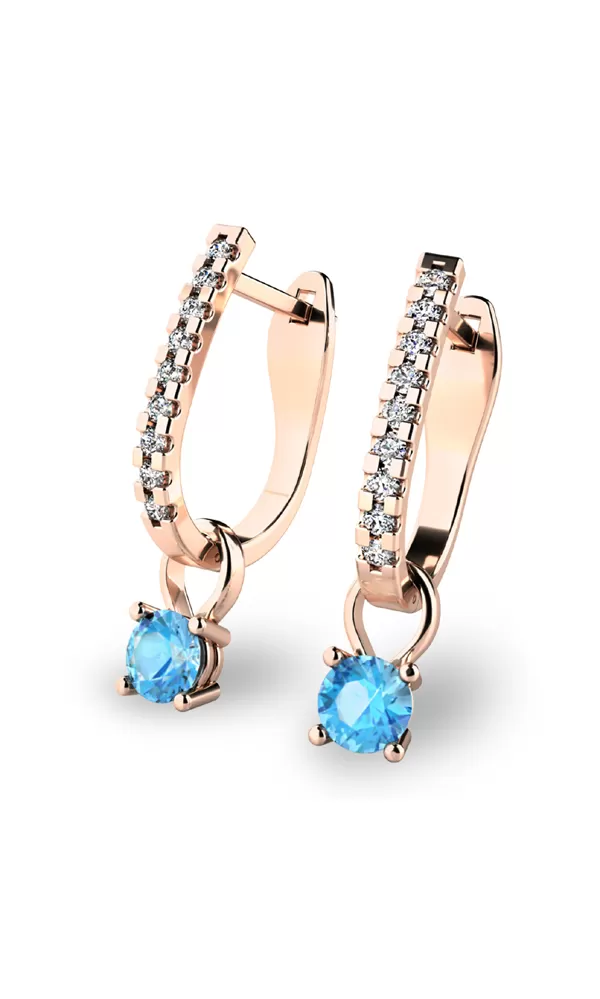 Náušnice "podkovičky" patří mezi velmi oblíbený typ náušnic, které jsou vhodné pro každodenní nošení i na společenské akce a sluší každé ženě. Tento model je zdoben osmnácti diamanty a dvěma topazy vsazenými do přívěsků. Všechny kameny jsou v briliantovém brusu, díky kterému dokonale odráží světlo a neuvěřitelné září. Vsazování diamantů a drahých kamenů provádějí naši nejzkušenější mistři zlatníci ručně pod mikroskopem s přesností na 0,01mm a proto nehrozí vypadnutí kamínků jako to bývá u strojně vyráběných náušnic. Tyto nádherné náušnice jsou vyrobeny z růžového čtrnáctikarátového zlata - 585/1000 v lesklé povrchové úpravě.