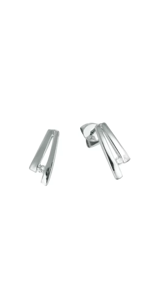 Jemné dámske náušnice sú vyrobené z bieleho štrnásťkarátového zlata - 585/1000 v lesklej povrchovej úprave. Náušnice sú vysadené sú vysadené dvoma diamantmi briliantového brusu a zapínajú sa na puzety.