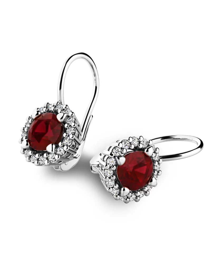 Nádherné luxusní dámské náušnice osázené středovým granátem a diamanty budou ideálním dárkem pro každou ženu. Náušnice jsou vyrobeny z bílého čtrnáctikarátového zlata - 585/1000 v lesklé povrchové úpravě. Vsazené diamanty jsou vybroušeny dokonalým briliantovým brusem, díky kterému dokonale odráží světlo a jejich brilance neuvěřitelné září z každého úhlu pohledu!  Všechny kameny jsou pevně uchyceny krapnami. Vsazování diamantů a drahých kamenů provádějí naši nejzkušenější mistři zlatníci ručně pod mikroskopem s přesností na 0,01mm a proto nehrozí vypadnutí kamínků jako to bývá u strojně vyráběných náušnic. Celé náušnice působí dokonalým a luxusním dojmem!