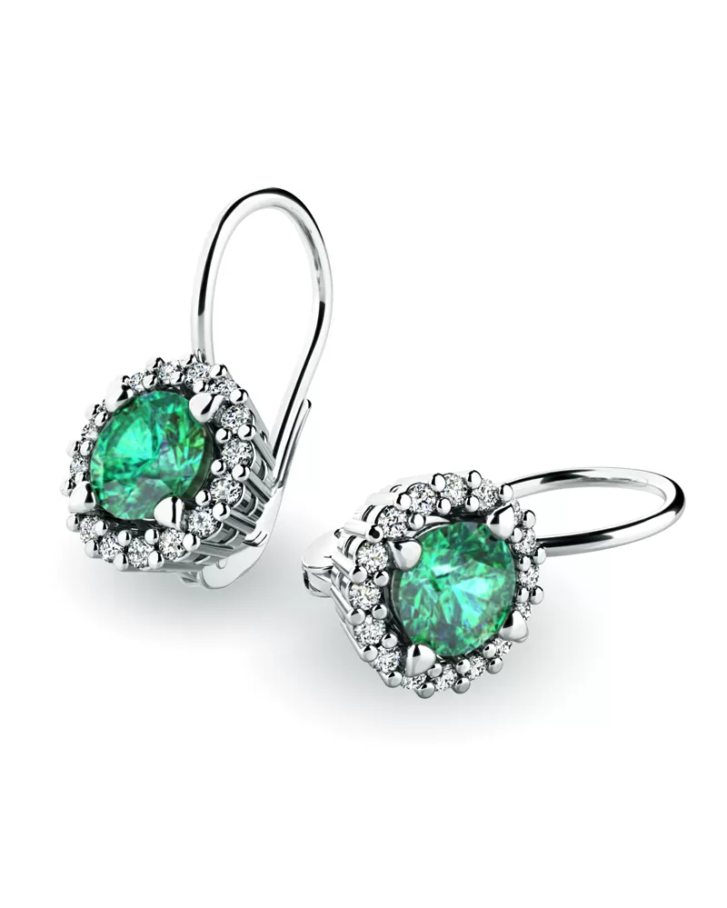 Nádherné luxusní dámské náušnice osázené středovým smaragdem a diamanty budou ideálním dárkem pro každou ženu. Náušnice jsou vyrobeny z bílého čtrnáctikarátového zlata - 585/1000 v lesklé povrchové úpravě. Vsazené diamanty jsou vybroušeny dokonalým briliantovým brusem, díky kterému dokonale odráží světlo a jejich brilance neuvěřitelné září z každého úhlu pohledu!  Všechny kameny jsou pevně uchyceny krapnami. Vsazování diamantů a drahých kamenů provádějí naši nejzkušenější mistři zlatníci ručně pod mikroskopem s přesností na 0,01mm a proto nehrozí vypadnutí kamínků jako to bývá u strojně vyráběných náušnic. Celé náušnice působí dokonalým a luxusním dojmem!