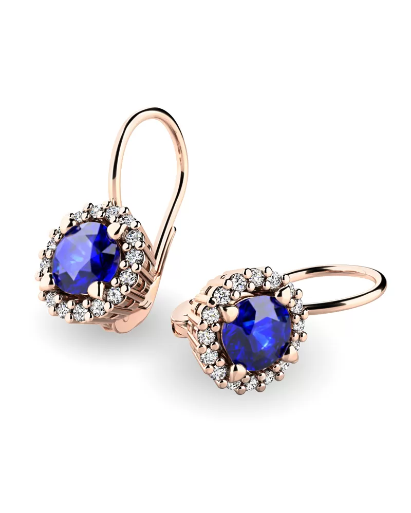 Nádherné luxusní dámské náušnice osázené středovým safírem a diamanty budou ideálním dárkem pro každou ženu. Náušnice jsou vyrobeny z růžového čtrnáctikarátového zlata - 585/1000 v lesklé povrchové úpravě. Vsazené diamanty jsou vybroušeny dokonalým briliantovým brusem, díky kterému dokonale odráží světlo a jejich brilance neuvěřitelné září z každého úhlu pohledu!  Všechny kameny jsou pevně uchyceny krapnami. Vsazování diamantů a drahých kamenů provádějí naši nejzkušenější mistři zlatníci ručně pod mikroskopem s přesností na 0,01mm a proto nehrozí vypadnutí kamínků jako to bývá u strojně vyráběných náušnic. Celé náušnice působí dokonalým a luxusním dojmem!