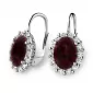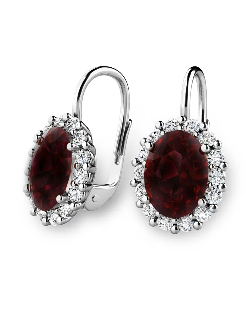 Nádherné luxusní dámské náušnice osázené středovým granátem - almandinem a diamanty budou ideálním dárkem pro každou ženu. Náušnice jsou vyrobeny z bílého čtrnáctikarátového zlata - 585/1000 v lesklé povrchové úpravě. Vsazené diamanty jsou vybroušeny dokonalým briliantovým brusem, díky kterému dokonale odráží světlo a jejich brilance neuvěřitelné září z každého úhlu pohledu! Všechny kameny jsou pevně uchyceny krapnami. Vsazování diamantů a drahých kamenů provádějí naši nejzkušenější mistři zlatníci ručně pod mikroskopem s přesností na 0,01mm a proto nehrozí vypadnutí kamínků jako to bývá u strojně vyráběných náušnic. Celé náušnice působí dokonalým a luxusním dojmem!