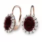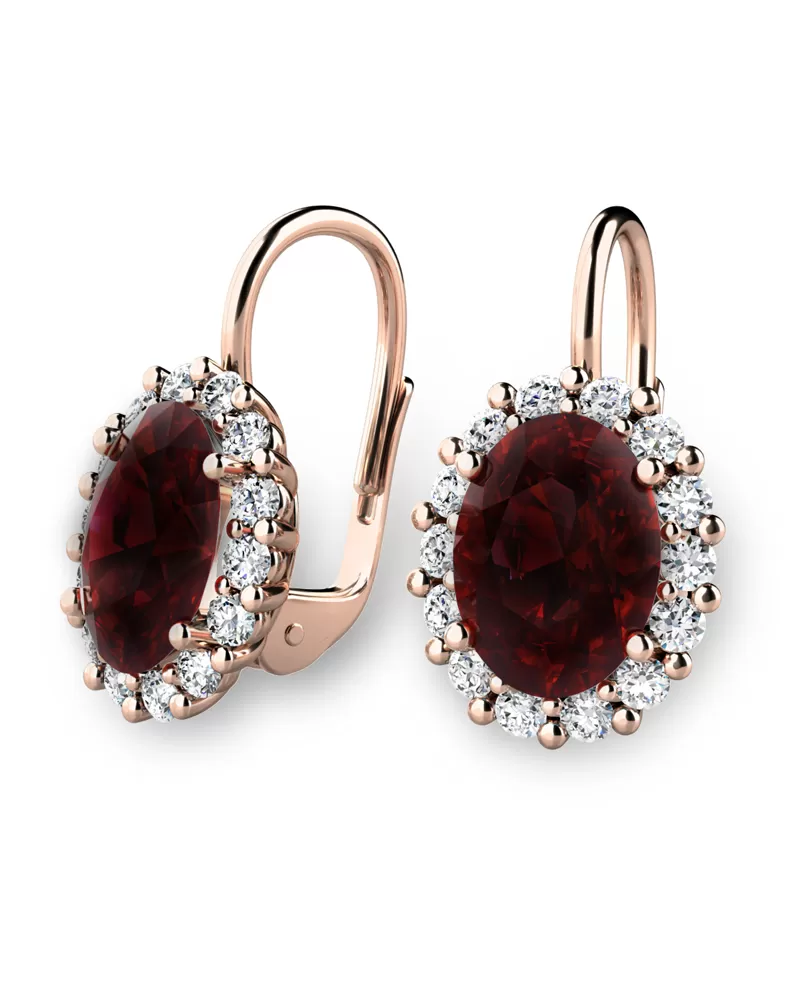 Nádherné luxusní dámské náušnice osázené středovým granátem - almandinem a diamanty budou ideálním dárkem pro každou ženu. Náušnice jsou vyrobeny z růžového čtrnáctikarátového zlata - 585/1000 v lesklé povrchové úpravě. Vsazené diamanty jsou vybroušeny dokonalým briliantovým brusem, díky kterému dokonale odráží světlo a jejich brilance neuvěřitelné září z každého úhlu pohledu! Všechny kameny jsou pevně uchyceny krapnami. Vsazování diamantů a drahých kamenů provádějí naši nejzkušenější mistři zlatníci ručně pod mikroskopem s přesností na 0,01mm a proto nehrozí vypadnutí kamínků jako to bývá u strojně vyráběných náušnic. Celé náušnice působí dokonalým a luxusním dojmem!