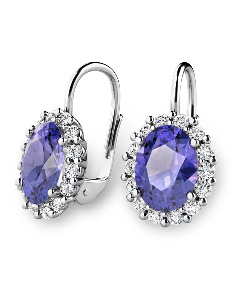 Nádherné luxusní dámské náušnice osázené středovým tanzanitem a diamanty budou ideálním dárkem pro každou ženu. Náušnice jsou vyrobeny z bílého čtrnáctikarátového zlata - 585/1000 v lesklé povrchové úpravě. Vsazené diamanty jsou vybroušeny dokonalým briliantovým brusem, díky kterému dokonale odráží světlo a jejich brilance neuvěřitelné září z každého úhlu pohledu! Všechny kameny jsou pevně uchyceny krapnami. Vsazování diamantů a drahých kamenů provádějí naši nejzkušenější mistři zlatníci ručně pod mikroskopem s přesností na 0,01mm a proto nehrozí vypadnutí kamínků jako to bývá u strojně vyráběných náušnic. Celé náušnice působí dokonalým a luxusním dojmem!
