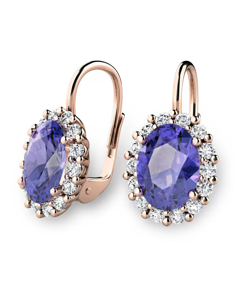 Nádherné luxusní dámské náušnice osázené středovým tanzanitem a diamanty budou ideálním dárkem pro každou ženu. Náušnice jsou vyrobeny z růžového čtrnáctikarátového zlata - 585/1000 v lesklé povrchové úpravě. Vsazené diamanty jsou vybroušeny dokonalým briliantovým brusem, díky kterému dokonale odráží světlo a jejich brilance neuvěřitelné září z každého úhlu pohledu! Všechny kameny jsou pevně uchyceny krapnami. Vsazování diamantů a drahých kamenů provádějí naši nejzkušenější mistři zlatníci ručně pod mikroskopem s přesností na 0,01mm a proto nehrozí vypadnutí kamínků jako to bývá u strojně vyráběných náušnic. Celé náušnice působí dokonalým a luxusním dojmem!