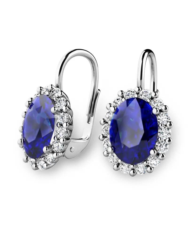 Nádherné luxusní dámské náušnice osázené středovými safíry a diamanty budou ideálním dárkem pro každou ženu. Náušnice jsou vyrobeny z bílého čtrnáctikarátového zlata - 585/1000 v lesklé povrchové úpravě. Vsazené diamanty jsou vybroušeny dokonalým briliantovým brusem, díky kterému dokonale odráží světlo a jejich brilance neuvěřitelné září z každého úhlu pohledu! Všechny kameny jsou pevně uchyceny krapnami. Vsazování diamantů a drahých kamenů provádějí naši nejzkušenější mistři zlatníci ručně pod mikroskopem s přesností na 0,01mm a proto nehrozí vypadnutí kamínků jako to bývá u strojně vyráběných náušnic. Celé náušnice působí dokonalým a luxusním dojmem!