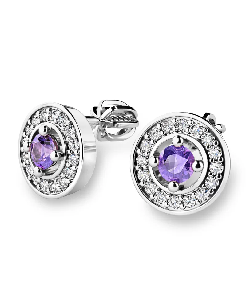 Nádherné luxusné dámske náušnice kôstky vysadené stredovým ametystom a diamantmi budú ideálnym darčekom pre každú ženu. Náušnice sú vyrobené z bieleho štrnásťkarátového zlata - 585/1000 v lesklej povrchovej úprave. Vsadené diamanty sú vybrúsené dokonalým briliantovým brusom, vďaka ktorému dokonale odráža svetlo a ich brilancia neuveriteľné žiari z každého uhla pohľadu!  Všetky kamene sú pevne uchytené krapnami. Vsadzovanie diamantov a drahých kameňov vykonávajú naši najskúsenejší majstri zlatníci ručne pod mikroskopom s presnosťou na 0,01 mm a preto nehrozí vypadnutie kamienkov ako to býva u strojne vyrábaných náušníc. Celé náušnice pôsobia dokonalým a luxusným dojmom! Náušnice sa zapínajú na skrutku. Skrutka na balónik je umiestnená cca 2 mm pod horný okraj náušnice a teda krásne zakrýva dierku v uchu.