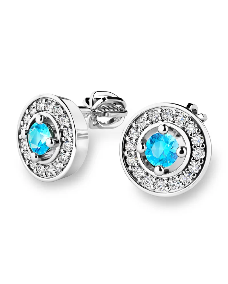 Nádherné luxusné dámske náušnice kôstky vysadené stredovým topazom a diamantmi budú ideálnym darčekom pre každú ženu. Náušnice sú vyrobené z bieleho štrnásťkarátového zlata - 585/1000 v lesklej povrchovej úprave. Vsadené diamanty sú vybrúsené dokonalým briliantovým brusom, vďaka ktorému dokonale odráža svetlo a ich brilancia neuveriteľné žiari z každého uhla pohľadu! Všetky kamene sú pevne uchytené krapnami. Vsadzovanie diamantov a drahých kameňov vykonávajú naši najskúsenejší majstri zlatníci ručne pod mikroskopom s presnosťou na 0,01 mm a preto nehrozí vypadnutie kamienkov ako to býva u strojne vyrábaných náušníc. Celé náušnice pôsobia dokonalým a luxusným dojmom! Náušnice sa zapínajú na skrutku. Skrutka na balónik je umiestnená cca 2 mm pod horný okraj náušnice a teda krásne zakrýva dierku v uchu.
