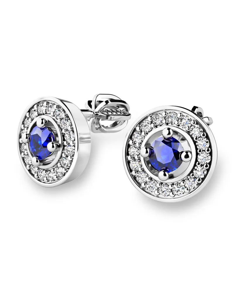 Nádherné luxusné dámske náušnice kôstky vysadené stredovým zafírom a diamantmi budú ideálnym darčekom pre každú ženu. Náušnice sú vyrobené z bieleho štrnásťkarátového zlata - 585/1000 v lesklej povrchovej úprave. Vsadené diamanty sú vybrúsené dokonalým briliantovým brusom, vďaka ktorému dokonale odráža svetlo a ich brilancia neuveriteľné žiari z každého uhla pohľadu! Všetky kamene sú pevne uchytené krapnami. Vsadzovanie diamantov a drahých kameňov vykonávajú naši najskúsenejší majstri zlatníci ručne pod mikroskopom s presnosťou na 0,01 mm a preto nehrozí vypadnutie kamienkov ako to býva u strojne vyrábaných náušníc. Celé náušnice pôsobia dokonalým a luxusným dojmom! Náušnice sa zapínajú na skrutku. Skrutka na balónik je umiestnená cca 2 mm pod horný okraj náušnice a teda krásne zakrýva dierku v uchu.