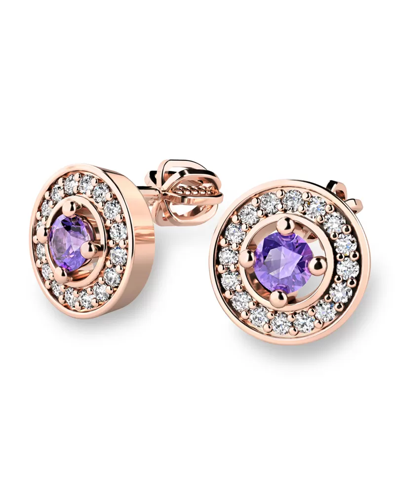 Nádherné luxusné dámske náušnice kôstky vysadené stredovým ametystom a diamantmi budú ideálnym darčekom pre každú ženu. Náušnice sú vyrobené z ružového štrnásťkarátového zlata - 585/1000 v lesklej povrchovej úprave. Vsadené diamanty sú vybrúsené dokonalým briliantovým brusom, vďaka ktorému dokonale odráža svetlo a ich brilancia neuveriteľné žiari z každého uhla pohľadu!  Všetky kamene sú pevne uchytené krapnami. Vsadzovanie diamantov a drahých kameňov vykonávajú naši najskúsenejší majstri zlatníci ručne pod mikroskopom s presnosťou na 0,01 mm a preto nehrozí vypadnutie kamienkov ako to býva u strojne vyrábaných náušníc. Celé náušnice pôsobia dokonalým a luxusným dojmom! Náušnice sa zapínajú na skrutku. Skrutka na balónik je umiestnená cca 2 mm pod horný okraj náušnice a teda krásne zakrýva dierku v uchu.