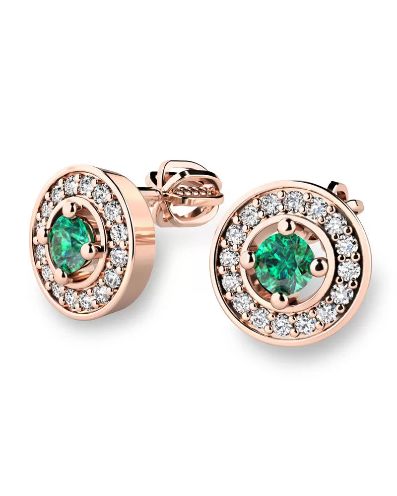 Nádherné luxusné dámske náušnice kôstky vysadené stredovým smaragdom a diamantmi budú ideálnym darčekom pre každú ženu. Náušnice sú vyrobené z ružového štrnásťkarátového zlata - 585/1000 v lesklej povrchovej úprave. Vsadené diamanty sú vybrúsené dokonalým briliantovým brusom, vďaka ktorému dokonale odráža svetlo a ich brilancia neuveriteľné žiari z každého uhla pohľadu!  Všetky kamene sú pevne uchytené krapnami. Vsadzovanie diamantov a drahých kameňov vykonávajú naši najskúsenejší majstri zlatníci ručne pod mikroskopom s presnosťou na 0,01 mm a preto nehrozí vypadnutie kamienkov ako to býva u strojne vyrábaných náušníc. Celé náušnice pôsobia dokonalým a luxusným dojmom! Náušnice sa zapínajú na skrutku. Skrutka na balónik je umiestnená cca 2 mm pod horný okraj náušnice a teda krásne zakrýva dierku v uchu.
