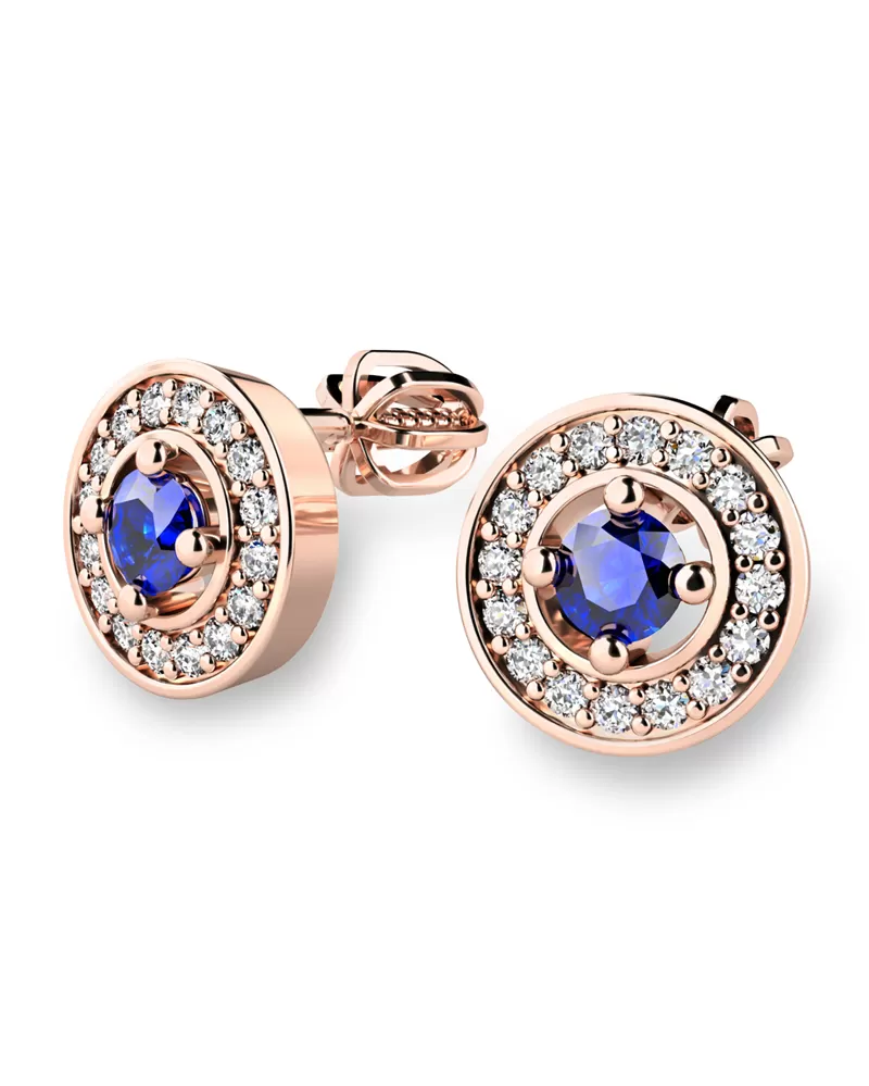 Nádherné luxusné dámske náušnice kôstky vysadené stredovým zafírom a diamantmi budú ideálnym darčekom pre každú ženu. Náušnice sú vyrobené z ružového štrnásťkarátového zlata - 585/1000 v lesklej povrchovej úprave. Vsadené diamanty sú vybrúsené dokonalým briliantovým brusom, vďaka ktorému dokonale odráža svetlo a ich brilancia neuveriteľné žiari z každého uhla pohľadu!  Všetky kamene sú pevne uchytené krapnami. Vsadzovanie diamantov a drahých kameňov vykonávajú naši najskúsenejší majstri zlatníci ručne pod mikroskopom s presnosťou na 0,01 mm a preto nehrozí vypadnutie kamienkov ako to býva u strojne vyrábaných náušníc. Celé náušnice pôsobia dokonalým a luxusným dojmom! Náušnice sa zapínajú na skrutku. Skrutka na balónik je umiestnená cca 2 mm pod horný okraj náušnice a teda krásne zakrýva dierku v uchu.
