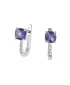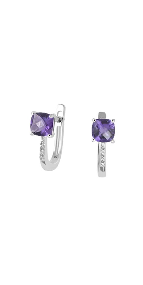 Žiarivé náušnice z bieleho štrnástich karátového zlata - 585/1000 v lesklej povrchovej úprave si obľúbi každá žena, ktorá túži po farbičkách a miluje fialovú farbu. Náušnice oplývajú fialovými ametystmi zbrúsenými do tvaru vankúšika a ôsmimi bielymi diamantmi. Náušnice sa zapínajú na pasívny patent, ktorý je bezpečný a nehrozí tak ich strata.
