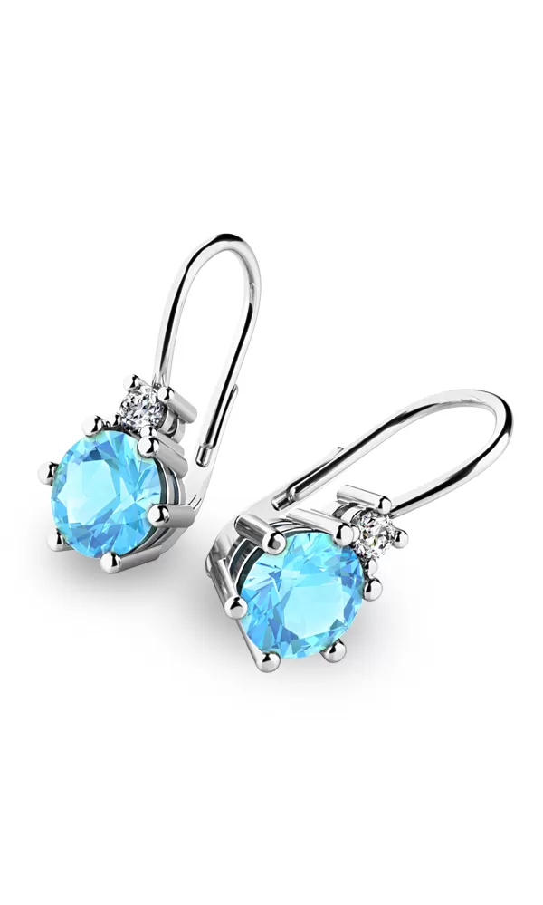Krásne a elegantné dámske náušnice sú vyrobené z bieleho štrnástich karátového zlata s rýdzosťou 585/1000 s lesklou povrchovou úpravou. Náušnice zdobia dva nádherné topazy vo svetlo modrej - swiss blue farbe a dva menšie diamanty vsadené nad topazy. Topazy aj diamanty sú brúsené do briliantového tvaru, ktorý zaručuje maximálny lesk kameňov a celého šperku.