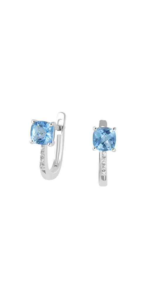 Žiarivé náušnice z bieleho štrnástich karátového zlata - 585/1000 v lesklej povrchovej úprave si obľúbi každá žena, ktorá túži po farbičkách a miluje modrú farbu. Náušnice oplývajú modrými Topazmi, zbrúsenými do tvaru vankúšika a ôsmimi bielymi diamantmi. Náušnice sa zapínajú na pasívny patent, ktorý je bezpečný a nehrozí tak ich strata.