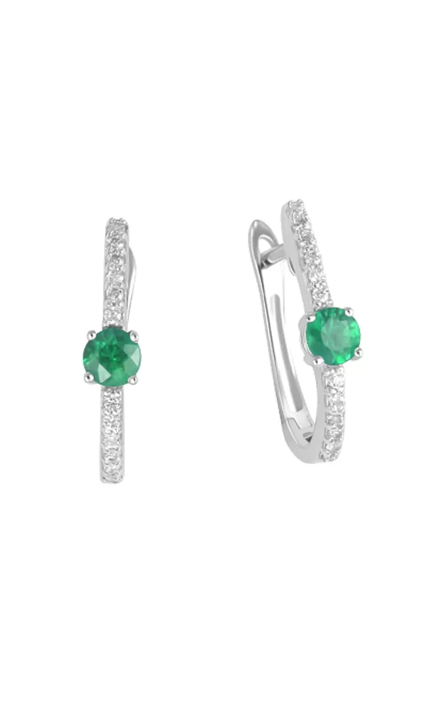 Luxusné dámske náušnice vyrobené z bieleho štrnásťkarátového zlata rýdzosti 585/1000 sú zdobené štyri a dvadsiatimi diamantmi v briliantovom bruse, ktoré sú doplnené o prírodné smaragd okrúhleho tvaru. Náušnice sú v lesklej povrchovej úprave, ktorá znásobuje lesk a ligot prvotriednych kameňov, ktoré sú precízne brúsené a starostlivo usadené do šperku. Zlaté dámske náušnice sa zapínajú na pasívny patent. ktorý je spoľahlivý a bezpečný.
