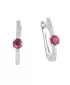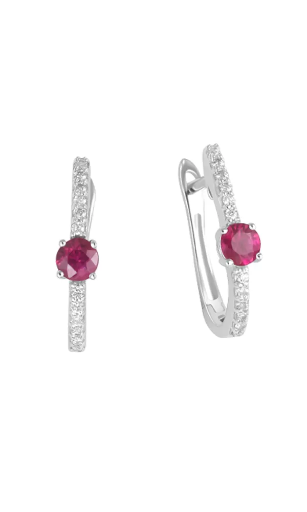 Luxusné dámske náušnice vyrobené z bieleho štrnásťkarátového zlata rýdzosti 585/1000 sú zdobené štyri a dvadsiatimi diamantmi v briliantovom bruse, ktoré sú doplnené o prírodný rubín okrúhleho tvaru. Náušnice sú v lesklej povrchovej úprave, ktorá znásobuje lesk a ligot prvotriednych kameňov, ktoré sú precízne brúsené a starostlivo usadené do šperku. Zlaté dámske náušnice sa zapínajú na pasívny patent, ktorý je spoľahlivý a bezpečný.