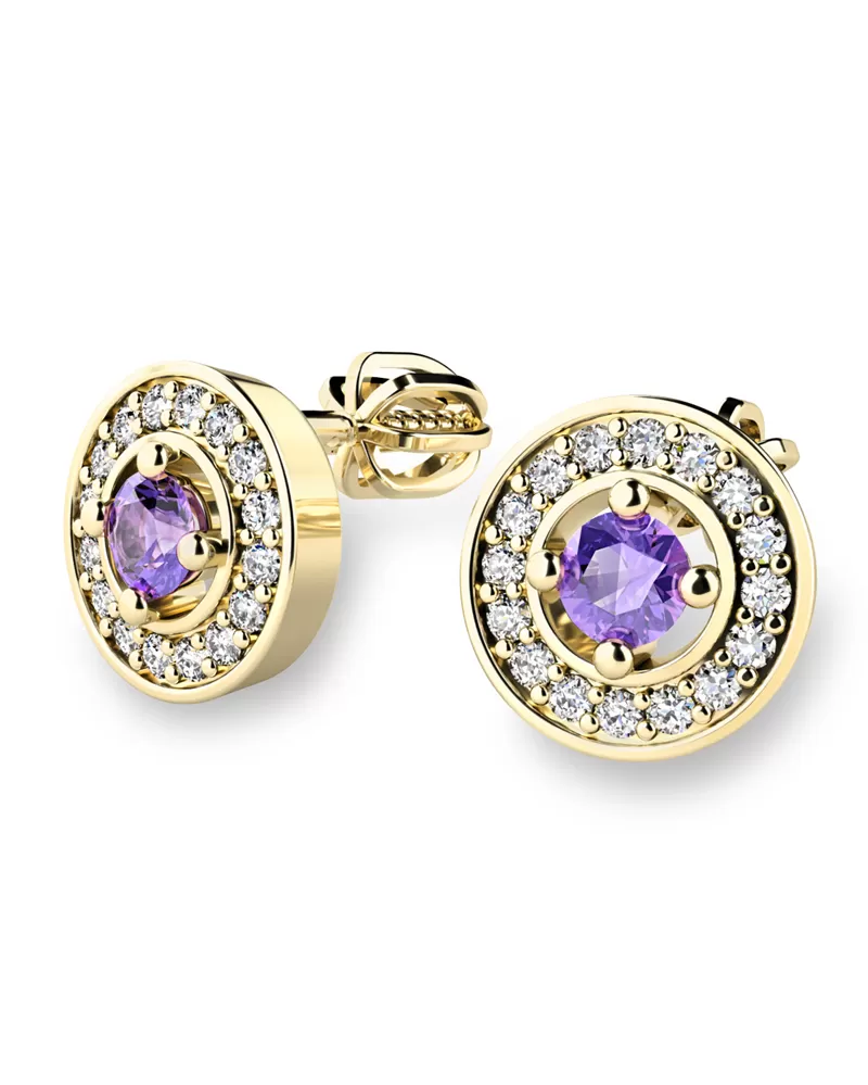 Náušnice žlté zlato 585/1000, prírodné diamanty a ametysty, 10921-ZL-AME
