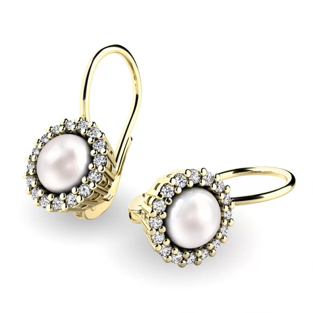 Nádherné dámské náušnice zdobené sladkovodními perlami a diamanty budou ideálním dárkem pro každou ženu. Náušnice jsou vyrobeny ze žlutého čtrnáctikarátového zlata - 585/1000 v lesklé povrchové úpravě. Perlu střeží dokola vsazené diamanty briliantového brusu, které jsou pevně uchyceny krapnami. Vsazování diamantů provádějí naši nejzkušenější mistři zlatníci ručně pod mikroskopem s přesností na 0,01mm a proto nehrozí vypadnutí kamínků jako to bývá u strojně vyráběných náušnic.