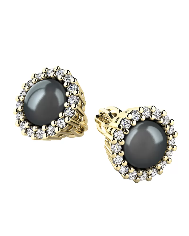 Nádherné dámské náušnice pecky zdobené přírodními sladkovodními černými perlami a diamanty budou ideálním dárkem pro každou ženu. Náušnice jsou vyrobeny ze žlutého čtrnáctikarátového zlata - 585/1000 v lesklé povrchové úpravě. Perlu střeží dokola vsazené diamanty briliantového brusu, které jsou pevně uchyceny krapnami. Vsazování diamantů provádějí naši nejzkušenější mistři zlatníci ručně pod mikroskopem s přesností na 0,01mm a proto nehrozí vypadnutí kamínků jako to bývá u strojně vyráběných náušnic. Náušnice se zapínají na šroubek. Šroubek pro balónek je umístěný cca 2 mm pod horní okraj náušnice a tedy krásně zakrývá dírku v uchu.