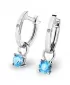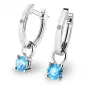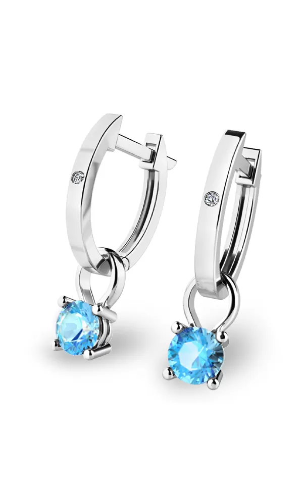 Jemné náušnice - oválky jsou vhodné pro každodenní nošení i na společenské akce a jistě budou slušet každé ženě. Tento model je zdoben dvěma menšími kulatými diamanty a zavěšenými korunkami osazenými krásnými modrými topazy. Všechny kameny jsou v briliantovém brusu, který dodává kamenům maximální brilanci a lesk. Vsazování diamantů a drahých kamenů provádějí naši nejzkušenější mistři zlatníci ručně pod mikroskopem s přesností na 0,01mm a proto nehrozí vypadnutí kamínků jako to bývá u strojně vyráběných náušnic. Tyto elegantní náušnice jsou vyrobeny z bílého čtrnáctikarátového zlata - 585/1000 v lesklé povrchové úpravě.