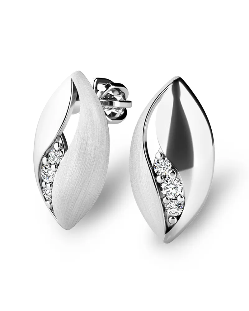 Dámské náušnice pecky jsou velmi oblíbené. Náušnice mají ozdobu ve tvaru kapky, která je rozdělena vlnkovou linií na dvě části. Linie je v dolní části osazena třemi zářivými diamanty v každé náušnici. Diamanty jsou vybroušené kulatým briliantovým brusem, který zajišťuje maximální brilanci vybroušených facet, dokonale odráží světlo a neuvěřitelné září z každého úhlu pohledu!  Tyto nádherné, zářivé náušnice jsou vyrobeny z bílého čtrnáctikarátového zlata - 585/1000 a to buď v kombinaci lesklé a matné povrchové úpravy nebo pouze v lesklém provedení.