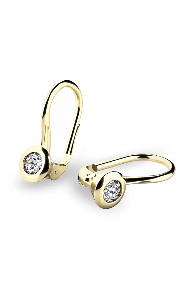 Dlhoveký model klasických náušníc zdobia dva väčšie oslňujúce diamanty briliantového brusu. Tieto žiarivé náušnice sú vyrobené zo žltého štrnásťkarátového zlata - 585/1000 v lesklej povrchovej úprave. Diamanty sú vsadené "na hladko" uprostred okrúhle lesklej obruby a opticky ich zväčšuje lesklý lem okolo diamantov. Vďaka precíznemu brúsu diamanty získali dokonalú brilanciu. Skvele odráža svetlo a september! Náušnice sa vyrábajú aj v žltom zlate a zapínajú sa na klapku.