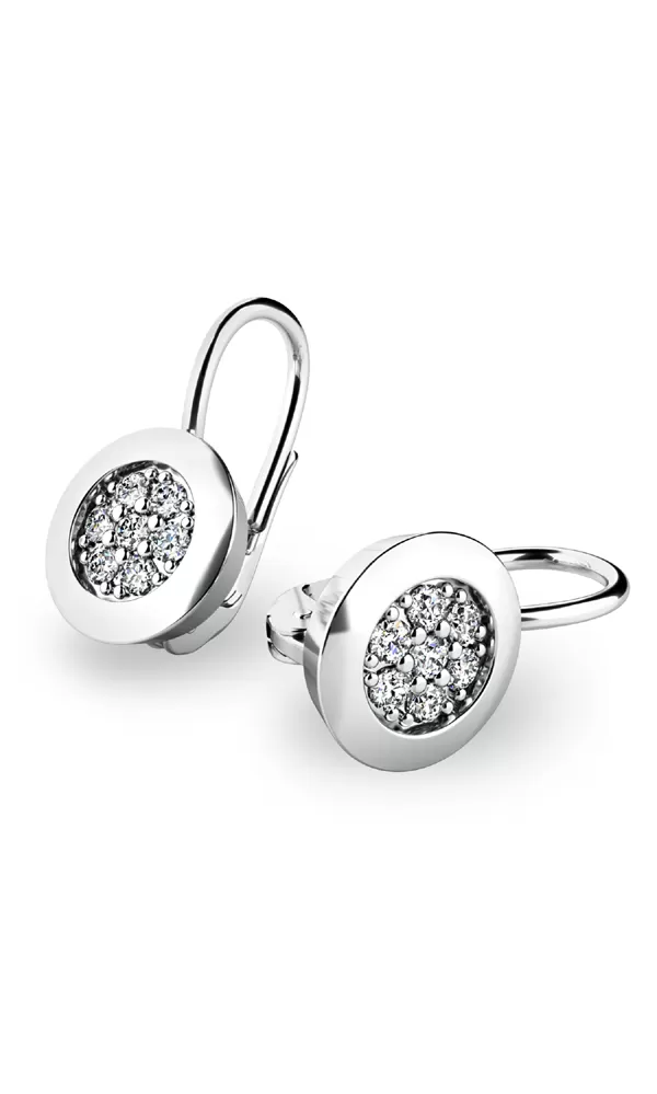 Klasický dizajn náušníc v elegantnej kombinácii lesklej obruby a štrnástich diamantov. Tieto nádherné, žiarivé náušnice sú vyrobené z bieleho štrnásťkarátového zlata - 585/1000 a sú celé v lesklej povrchovej úprave. Nušnice sú zdobené štrnástimi diamantmi briliantového brusu. Vďaka precíznemu brúsu diamanty získajú dokonalú brilanciu. Skvele odráža svetlo a september. Práca našich zlatníkov je taká mimoriadna, že uvidíte dokonalé spracovanie v každom detaile!  Zapínanie náušníc je na klapku.