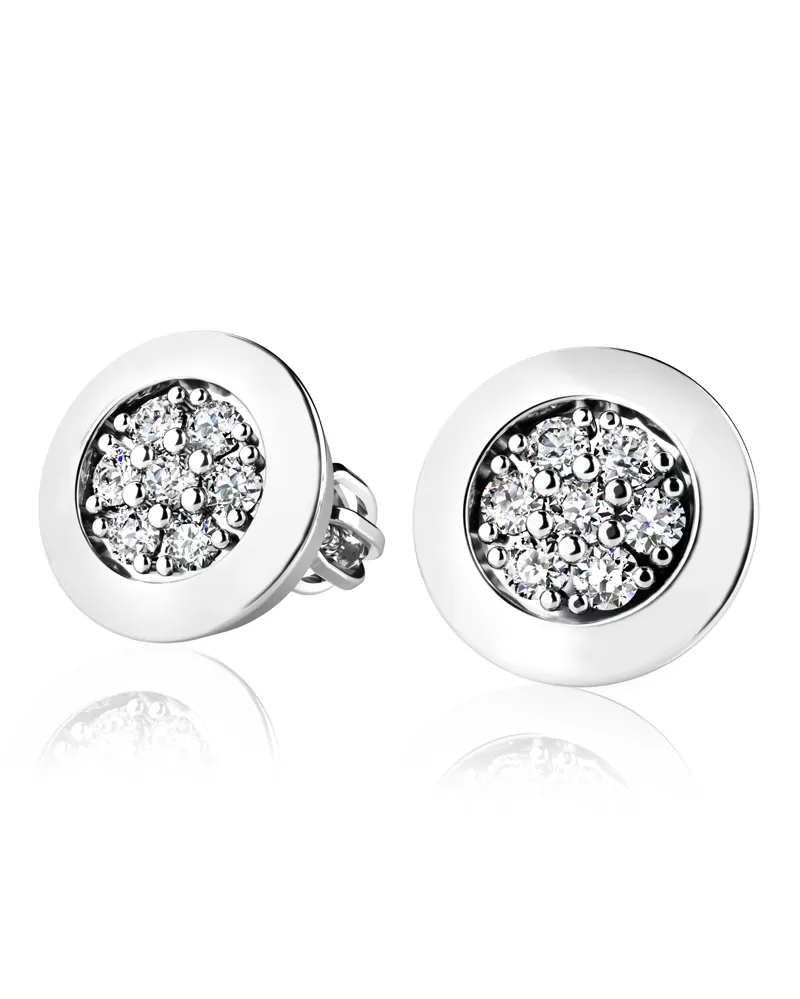 Elegantné náušnice v kombinácii lesklej obruby a štrnástich diamantov . Tieto nádherné, žiarivé náušnice sú vyrobené z bieleho štrnásťkarátového zlata - 585/1000 a sú celé v lesklej povrchovej úprave. Nušnice sú zdobené štrnástimi diamantmi briliantového brusu. Vďaka precíznemu brúsu diamanty získajú dokonalú brilanciu, skvele odrážajú svetlo a žiaria z každého uhla pohľadu. Vsadzovanie diamantov vykonávajú naši najskúsenejší majstri zlatníci ručne pod mikroskopom s presnosťou na 0,01 mm a preto nehrozí vypadnutie kamienkov ako to býva u strojne vyrábaných náušníc. Práca našich zlatníkov je tak mimoriadna, že uvidíte dokonalé spracovanie v každom detaile! Zapínanie náušníc je na skrutku a balónik.