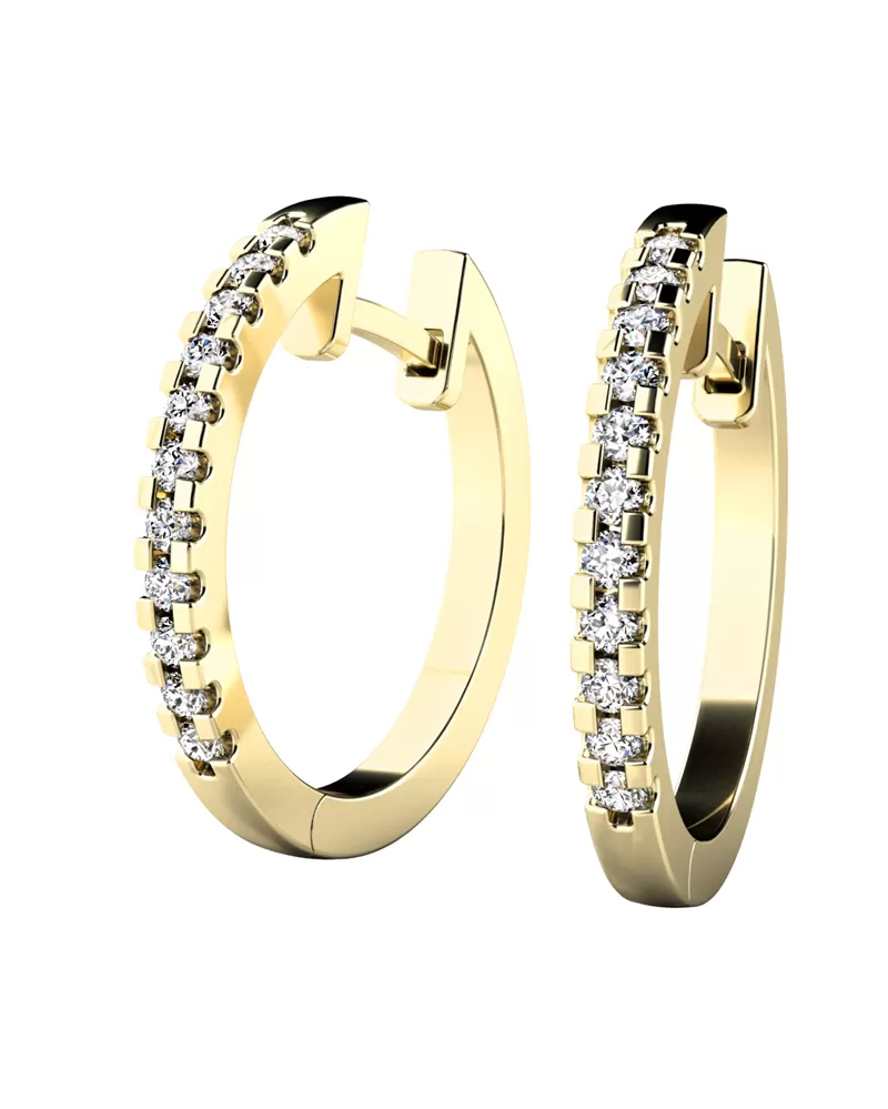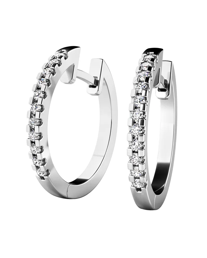 Náušnice kruhy patří mezi vůbec nejoblíbenější typ náušnic, náušnice jsou vhodné pro každodenní nošení i na společenské akce a sluší každé ženě! Tyto elegantní kruhy jsou vyrobeny z bílého čtrnáctikarátového zlata - 585/1000 v lesklé povrchové úpravě a s mírně půlkulatou horní plochou. V náušnicích je vsazeno dvacetdva kulatých diamantů v briliantovém brusu, díky kterému dokonale odráží světlo a neuvěřitelné září. Vsazování diamantů provádějí naši nejzkušenější mistři zlatníci ručně pod mikroskopem s přesností na 0,01mm a proto nehrozí vypadnutí kamínků jako to bývá u strojně vyráběných náušnic. Na náušnicích se "nešetřilo zlatem", což bývá většinou znakem velkosériových produktů, proto jsou pevné a snesou i hrubší zacházení