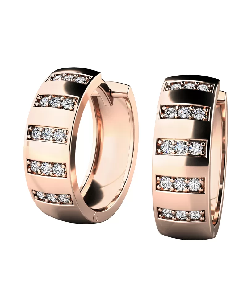 Náušnice kruhy patří mezi vůbec nejoblíbenější typ náušnic, náušnice jsou vhodné pro každodenní nošení i na společenské akce a sluší každé ženě! Tyto elegantní kruhy jsou vyrobeny z růžového čtrnáctikarátového zlata - 585/1000 v lesklé povrchové úpravě a s mírně půlkulatou horní plochou. V náušnicích je vsazeno třicet kulatých diamantů v briliantovém brusu, díky kterému dokonale odráží světlo a neuvěřitelné září. Vsazování diamantů provádějí naši nejzkušenější mistři zlatníci ručně pod mikroskopem s přesností na 0,01mm a proto nehrozí vypadnutí kamínků jako to bývá u strojně vyráběných náušnic. Na náušnicích se "nešetřilo zlatem", proto jsou pevné a snesou i hrubší zacházení