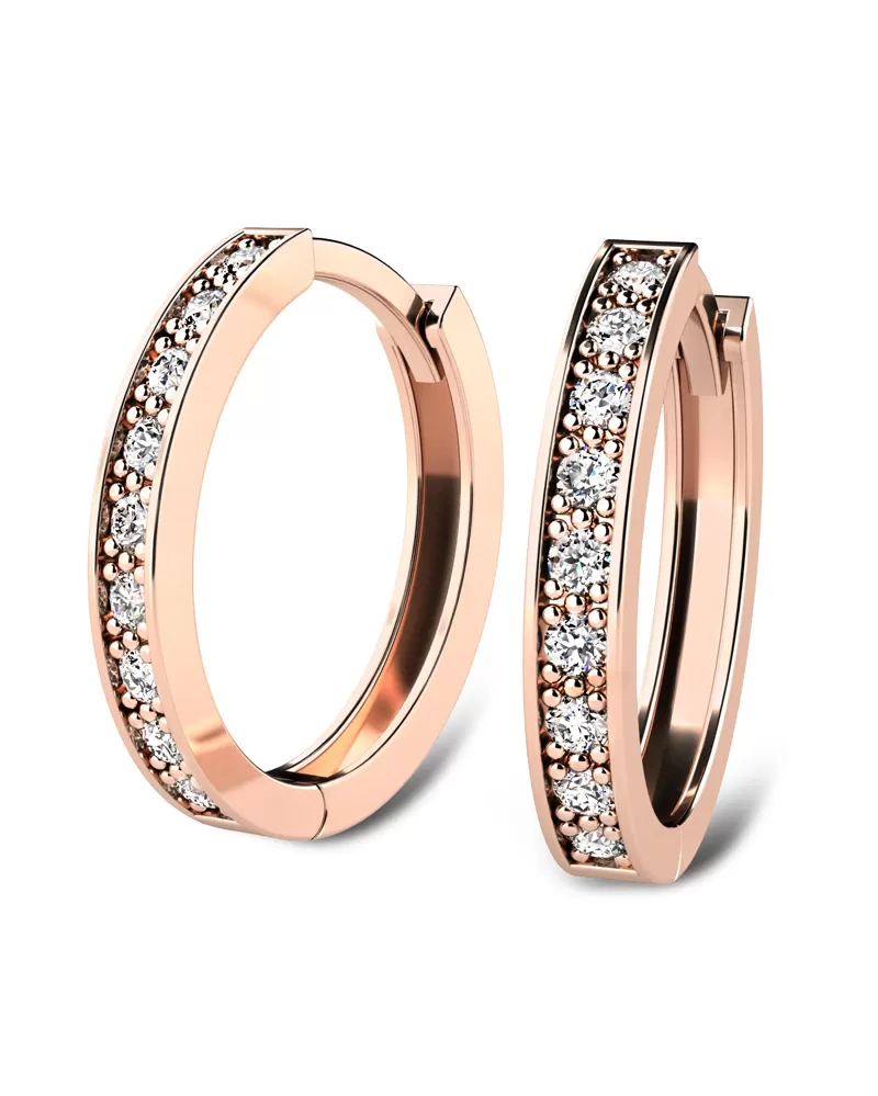 Náušnice kruhy - v tomto případě oválky, patří mezi vůbec nejoblíbenější typ náušnic, náušnice jsou vhodné pro každodenní nošení i na společenské akce a sluší každé ženě! Jsou vyrobeny z růžového čtrnáctikarátového zlata - 585/1000 v lesklé povrchové úpravě. V náušnicích je vsazeno "do zrnek" osmnáct kulatých přírodních diamantů, vybroušených kulatým briliantovým brusem, který zajišťuje maximální brilanci vybroušených facet ze všech úhlů pohledu! Vsazování diamantů provádějí naši nejzkušenější mistři zlatníci ručně pod mikroskopem s přesností na 0,01mm a proto nehrozí vypadnutí diamantů jako to bývá u strojně vyráběných šperků. Náušnice působí elegantním dojmem!