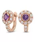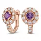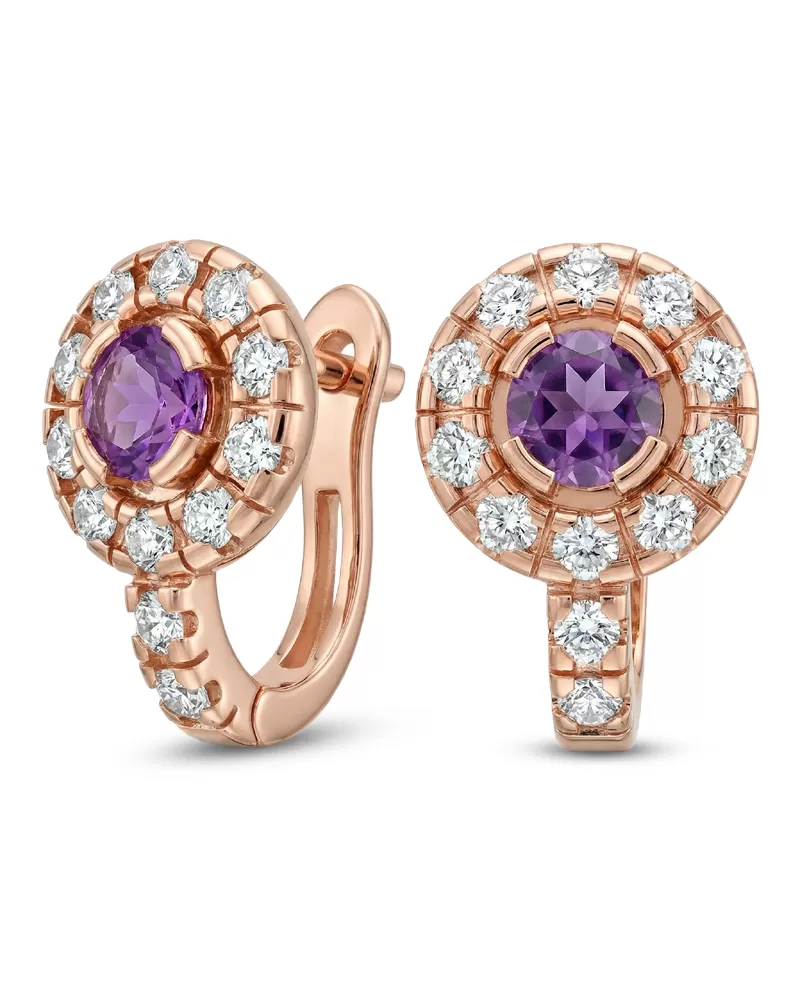 Náušnice typu "podkovičky" patria medzi veľmi obľúbené typy náušníc, náušnice sú vhodné na každodenné nosenie aj na spoločenské akcie a pristanú každej žene! Sú vyrobené z ružového štrnásťkarátového zlata - 585/1000 v lesklej povrchovej úprave. V náušniciach je vsadených "do krapničiek" dvadsaťštyri menších diamantov a dva väčšie centrálne ametysty. Všetky kamene sú vybrúsené okrúhlym briliantovým brusom, ktorý zaisťuje maximálnu brilanciu vybrúsených facet a krásne žiari zo všetkých uhlov pohľadu! Vsadzovanie diamantov a drahokamov vykonávajú naši najskúsenejší majstri zlatníci ručne pod mikroskopom s presnosťou na 0,01 mm a preto nehrozí vypadnutie diamantov ako to býva pri strojne vyrábaných šperkoch. Náušnice sú stredne veľké, na uchu vyzerajú elegantne a prirodzene a vďaka skladbe a štýlovo čistému vsadeniu diamantov vynikajú krásnou brilanciou kameňov!