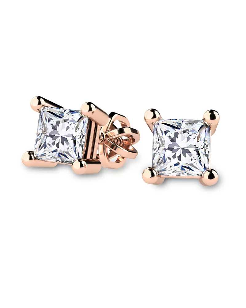 Náušnice typu "pecky" patří mezi velmi oblíbené typy náušnic, náušnice jsou vhodné pro každodenní nošení i na společenské akce a sluší každé ženě! Jsou vyrobeny z růžového čtrnáctikarátového zlata - 585/1000 v lesklé povrchové úpravě. V náušnicích jsou vsazeny "do pevných krapen" dva větší centrální diamanty. Diamanty jsou vybroušeny čtvercovým princess brusem, který zajišťuje maximální brilanci vybroušených facet ze všech úhlů pohledu! Vsazování diamantů provádějí naši nejzkušenější mistři zlatníci ručně pod mikroskopem s přesností na 0,01mm a proto nehrozí vypadnutí diamantů jako to bývá u strojně vyráběných šperků. Náušnice na uchu vypadají elegantně a přirozeně!