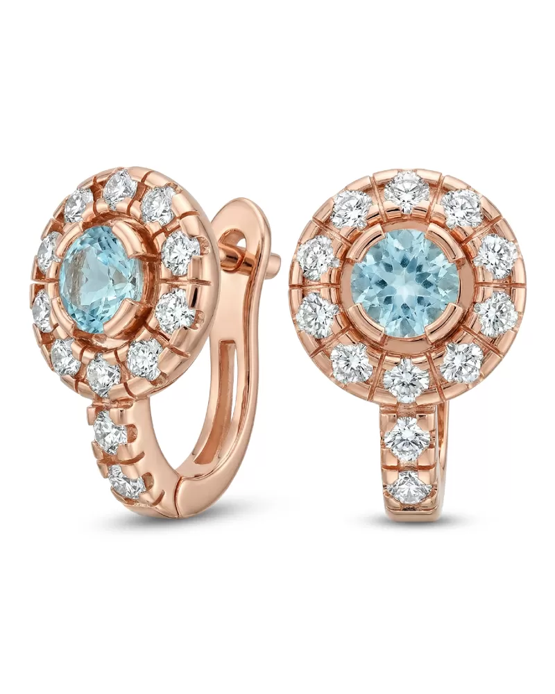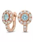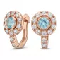 Náušnice typu "podkovičky" patria medzi veľmi obľúbené typy náušníc, náušnice sú vhodné na každodenné nosenie aj na spoločenské akcie a pristanú každej žene! Sú vyrobené z ružového štrnásťkarátového zlata - 585/1000 v lesklej povrchovej úprave. V náušniciach je vsadených "do krapničiek" dvadsaťštyri menších diamantov a dva väčšie centrálne topazy vo farbe Swiss blue. Všetky kamene sú vybrúsené okrúhlym briliantovým brusom, ktorý zaisťuje maximálnu brilanciu vybrúsených facet a krásne žiari zo všetkých uhlov pohľadu! Vsadzovanie diamantov a drahokamov vykonávajú naši najskúsenejší majstri zlatníci ručne pod mikroskopom s presnosťou na 0,01 mm a preto nehrozí vypadnutie diamantov ako to býva pri strojne vyrábaných šperkoch. Náušnice sú stredne veľké, na uchu vyzerajú elegantne a prirodzene a vďaka skladbe a štýlovo čistému vsadeniu diamantov vynikajú krásnou brilanciou kameňov!
