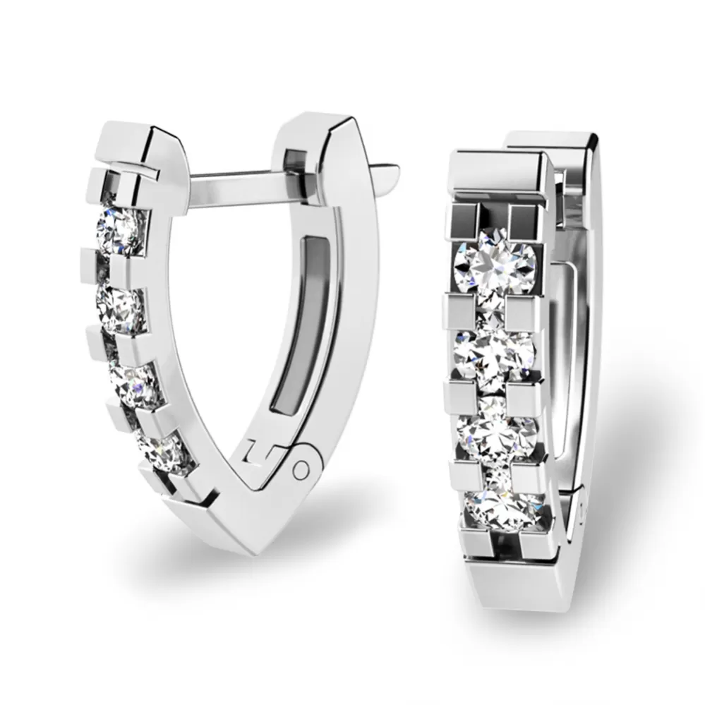 Moderné náušnice Vás oslovia nádhernou brilanciou diamantov vsadených vedľa seba! Diamanty sú vybrúsené okrúhlym briliantovým brusom, ktorý im dodáva maximálnu brilanciu, dokonale odráža svetlo a neuveriteľné september. Náušnice sú vyrobené z bieleho štrnásťkarátového zlata - 585/1000 v lesklej povrchovej úprave.