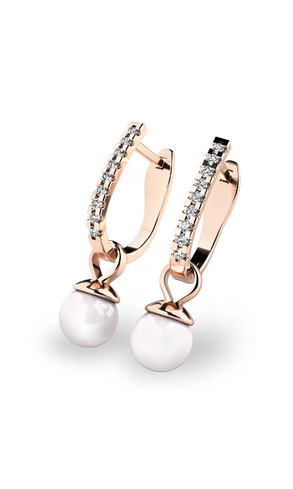 Dámské náušnice zdobené sladkovodními perlami a diamanty budou ideálním dárkem pro každou ženu. Tyto nádherné náušnice jsou vyrobeny z bílého čtrnáctikarátového zlata - 585/1000 v lesklé povrchové úpravě s devíti diamanty v každé náušnici . Diamanty jsou vybroušeny briliantovým brusem, díky kterému dokonale odráží světlo a neuvěřitelné září. Vsazování diamantů a drahých kamenů provádějí naši nejzkušenější mistři zlatníci ručně pod mikroskopem s přesností na 0,01mm a proto nehrozí vypadnutí kamínků jako to bývá u strojně vyráběných náušnic.