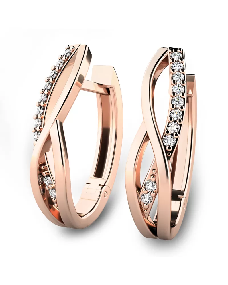 Tyto náušnice jsou vhodné pro každodenní nošení i na společenské akce a budou slušet každé ženě! Jsou vyrobeny z růžového čtrnáctikarátového zlata - 585/1000 v lesklé povrchové úpravě. V náušnicích je vsazeno dvacet kulatých diamantů v briliantovém brusu, který zajišťuje maximální brilanci vybroušených facet, dokonale odráží světlo a krásně září z každého úhlu pohledu! Vsazování diamantů provádějí naši nejzkušenější mistři zlatníci ručně pod mikroskopem s přesností na 0,01mm a proto nehrozí vypadnutí kamínků jako to bývá u strojně vyráběných šperků. Náušnice působí jemným a elegantním dojmem.
