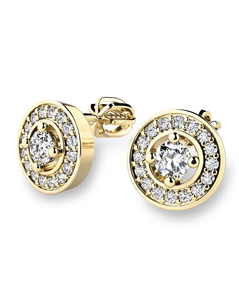 Nádherné luxusné dámske náušnice kôstky vysadené diamantmi budú ideálnym darčekom pre každú ženu. Náušnice sú vyrobené zo žltého štrnásťkarátového zlata - 585/1000 v lesklej povrchovej úprave. Vsadené diamanty sú vybrúsené dokonalým briliantovým brusom, vďaka ktorému dokonale odráža svetlo a ich brilancia neuveriteľné žiari z každého uhla pohľadu!  Všetky diamanty sú pevne uchytené krapnami. Vsadzovanie diamantov vykonávajú naši najskúsenejší majstri zlatníci ručne pod mikroskopom s presnosťou na 0,01 mm a preto nehrozí vypadnutie kamienkov ako to býva u strojne vyrábaných náušníc. Celé náušnice pôsobia dokonalým a luxusným dojmom! Náušnice sa zapínajú na skrutku. Skrutka na balónik je umiestnená cca 2 mm pod horný okraj náušnice a teda krásne zakrýva dierku v uchu.