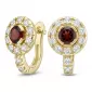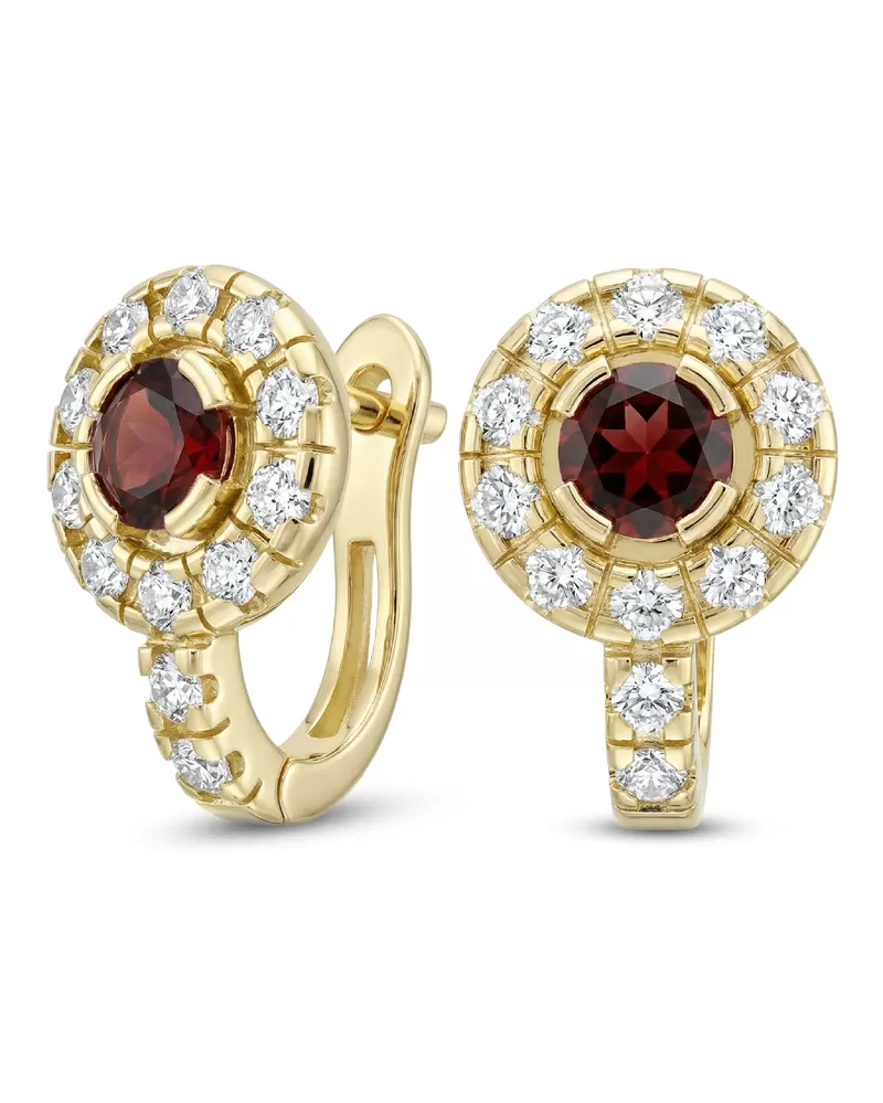 Náušnice typu "podkovičky" patria medzi veľmi obľúbené typy náušníc, náušnice sú vhodné na každodenné nosenie aj na spoločenské akcie a pristanú každej žene! Sú vyrobené zo žltého štrnásťkarátového zlata - 585/1000 v lesklej povrchovej úprave. V náušniciach je vsadených "do krapničiek" dvadsaťštyri menších diamantov a dva väčšie centrálne granáty. Všetky kamene sú vybrúsené okrúhlym briliantovým brusom, ktorý zaisťuje maximálnu brilanciu vybrúsených facet a krásne žiari zo všetkých uhlov pohľadu! Vsadzovanie diamantov a drahokamov vykonávajú naši najskúsenejší majstri zlatníci ručne pod mikroskopom s presnosťou na 0,01 mm a preto nehrozí vypadnutie diamantov ako to býva pri strojne vyrábaných šperkoch. Náušnice sú stredne veľké, na uchu vyzerajú elegantne a prirodzene a vďaka skladbe a štýlovo čistému vsadeniu diamantov vynikajú krásnou brilanciou kameňov!