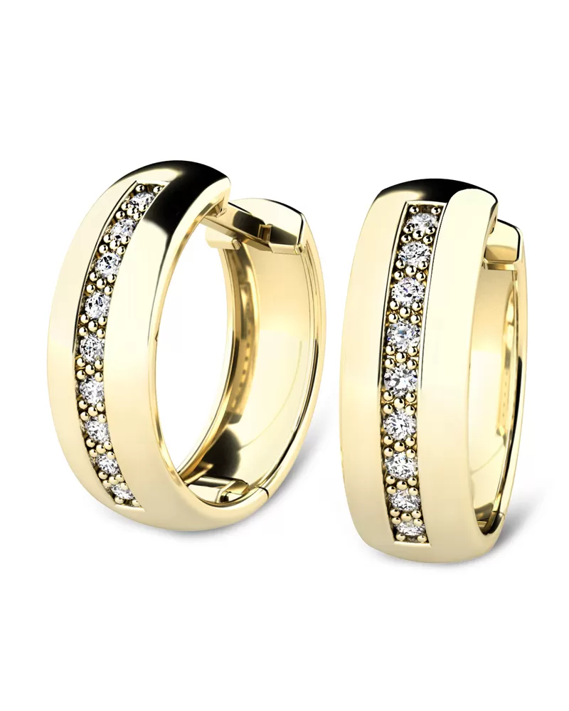 Náušnice kruhy patří mezi vůbec nejoblíbenější typ náušnic, náušnice jsou vhodné pro každodenní nošení i na společenské akce a sluší každé ženě! Jsou vyrobeny ze žlutého čtrnáctikarátového zlata - 585/1000 v lesklé povrchové úpravě. V náušnicích je vsazeno "do zrnek" osmnáct kulatých diamantů, vybroušený kulatým briliantovým brusem, který zajišťuje maximální brilanci vybroušených facet ze všech úhlů pohledu! Vsazování diamantů provádějí naši nejzkušenější mistři zlatníci ručně pod mikroskopem s přesností na 0,01mm a proto nehrozí vypadnutí diamantů jako to bývá u strojně vyráběných šperků. Náušnice jsou středně velké, na uchu vypadají elegantně a přirozeně!