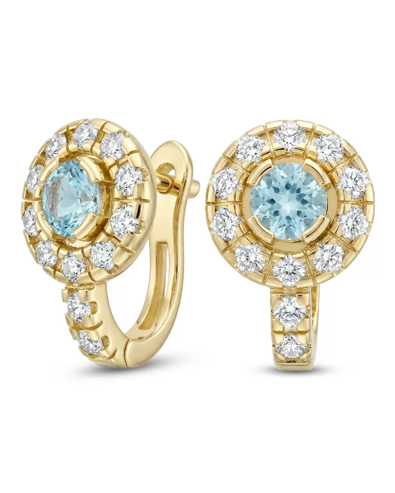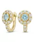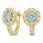 Náušnice typu "podkovičky" patria medzi veľmi obľúbené typy náušníc, náušnice sú vhodné na každodenné nosenie aj na spoločenské akcie a pristanú každej žene! Sú vyrobené zo žltého štrnásťkarátového zlata - 585/1000 v lesklej povrchovej úprave. V náušniciach je vsadených "do krapničiek" dvadsaťštyri menších diamantov a dva väčšie centrálne topazy vo farbe Swiss blue. Všetky kamene sú vybrúsené okrúhlym briliantovým brusom, ktorý zaisťuje maximálnu brilanciu vybrúsených facet a krásne žiari zo všetkých uhlov pohľadu! Vsadzovanie diamantov a drahokamov vykonávajú naši najskúsenejší majstri zlatníci ručne pod mikroskopom s presnosťou na 0,01 mm a preto nehrozí vypadnutie diamantov ako to býva pri strojne vyrábaných šperkoch. Náušnice sú stredne veľké, na uchu vyzerajú elegantne a prirodzene a vďaka skladbe a štýlovo čistému vsadeniu diamantov vynikajú krásnou brilanciou kameňov!