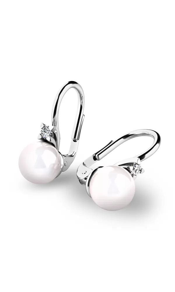 Tyto nádherné náušnice jsou vyrobeny z bílého čtrnáctikarátového zlata - 585/1000 v lesklé povrchové úpravě a zdobí je sladkovodní perly a diamanty. Diamanty jsou vybroušeny briliantovým brusem, který zajišťuje maximální brilanci vybroušených facet, dokonale odráží světlo a neuvěřitelně září z každého úhlu pohledu!  Vsazování diamantů provádějí naši nejzkušenější mistři zlatníci ručně pod mikroskopem s přesností na 0,01mm a proto nehrozí vypadnutí kamínků jako to bývá u strojně vyráběných náušnic.