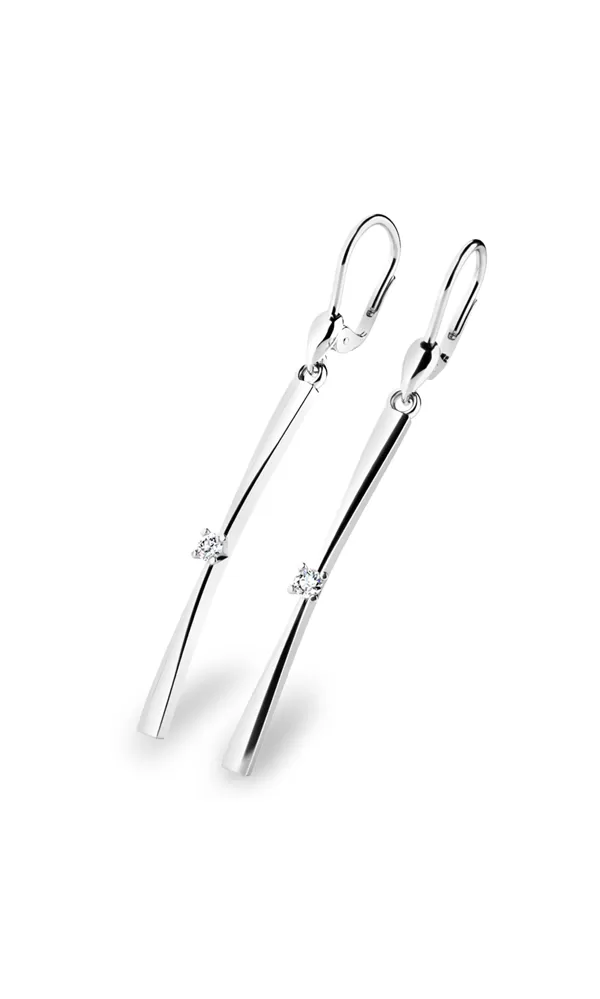 Tieto nádherné náušnice sú vyrobené z bieleho štrnásťkarátového zlata - 585/1000 v lesklej povrchovej úprave. Visiace náušnice sú zdobené jedným diamantom briliantového brusu, ktorý je vsadený uprostred náušníc. Vďaka precíznemu brúsu diamanty získajú dokonalú brilanciu. Skvele odráža svetlo a september. Zapínanie náušníc je na klapku. Diamant je symbolom čistoty. Pôsobí priaznivo na uchovanie pevných vzťahov, vyvoláva lásku a dodáva na priezračnosti partnerským vzťahom.