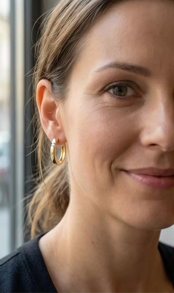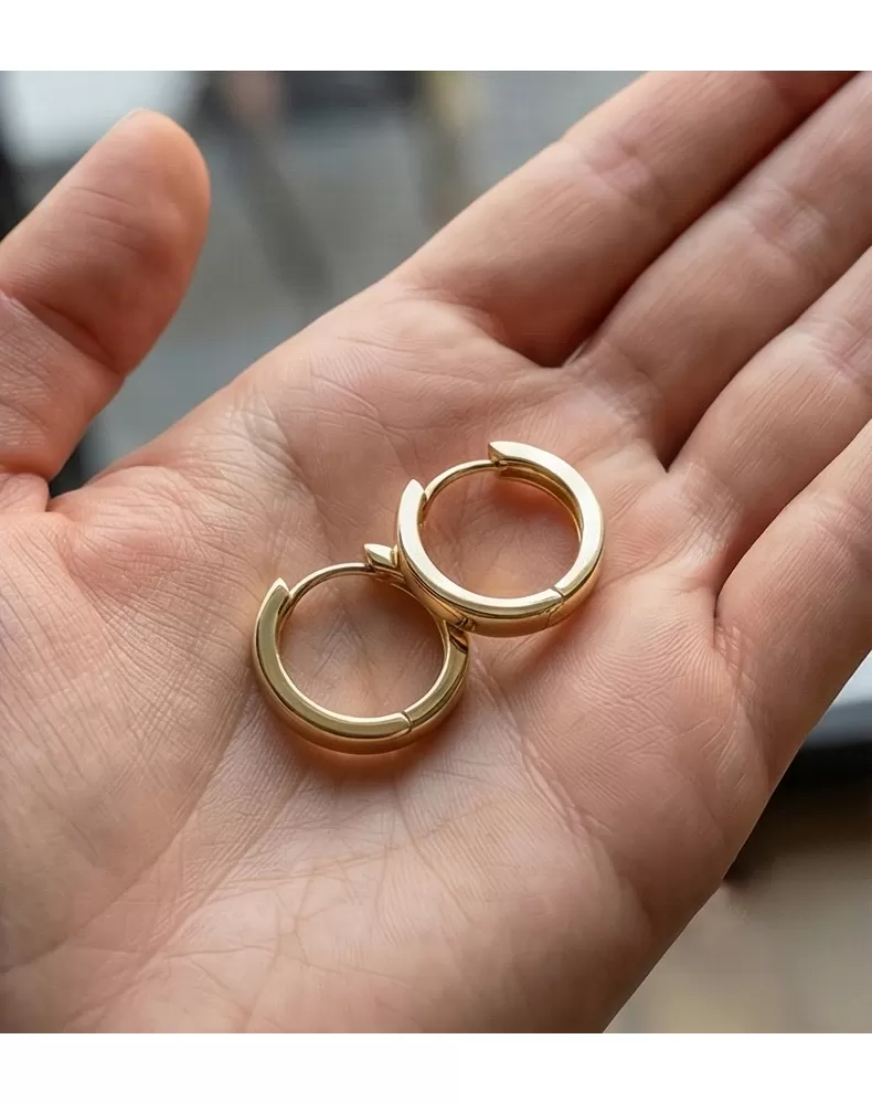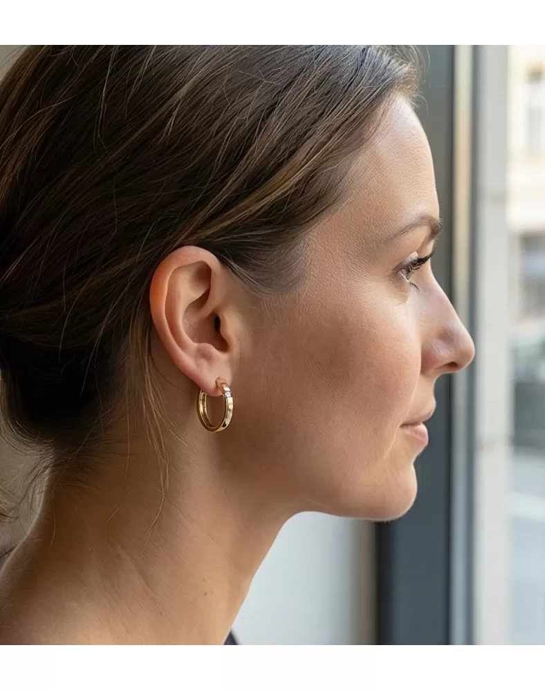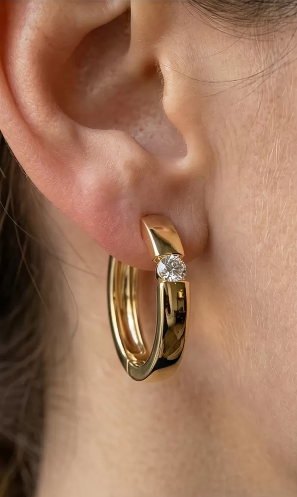 Náušnice kruhy patří mezi vůbec nejoblíbenější typ náušnic, Náušnice jsou vhodné pro každodenní nošení i na společenské akce a sluší každé ženě! Tyto elegantní kruhy jsou vyrobeny ze žlutého čtrnáctikarátového zlata - 585/1000 v lesklé povrchové úpravě a s mírně půlkulatou horní plochou. V náušnicích jsou vsazeny dva kulaté diamanty v briliantovém brusu, díky kterému dokonale odráží světlo a neuvěřitelné září.